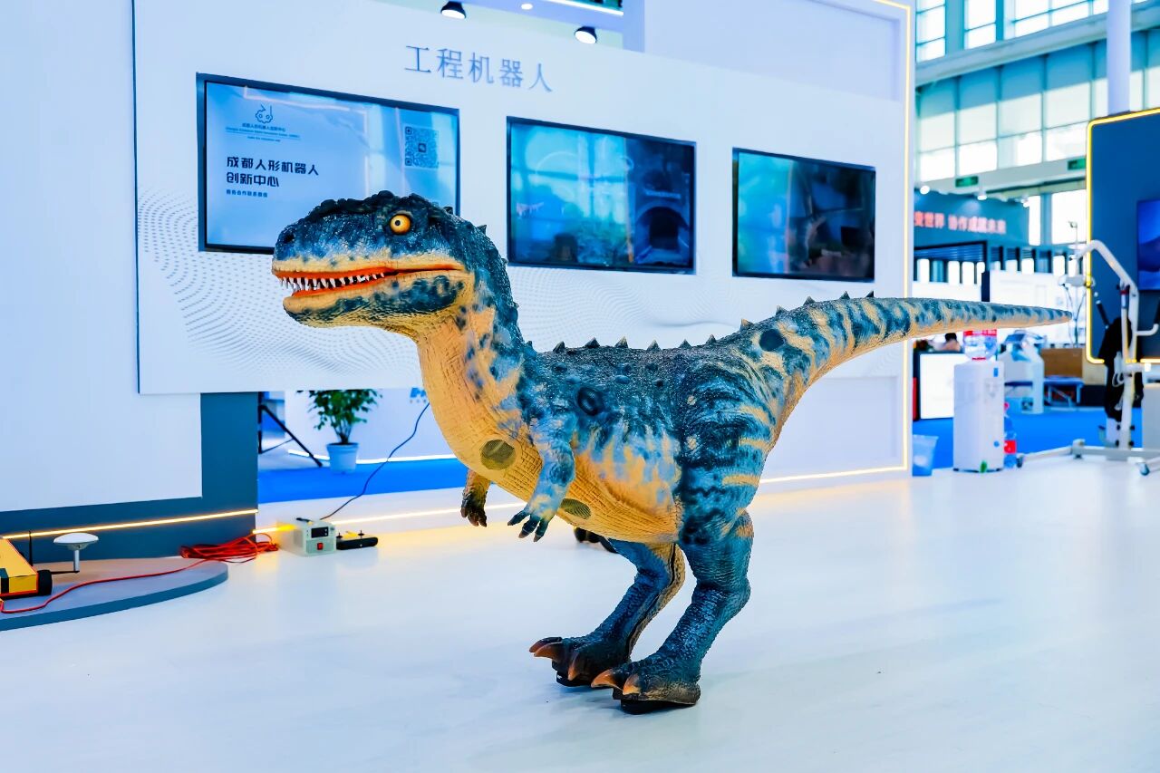 走进“金砖展”,各大龙头企业争相以硬核科技点燃未来想象。在成都人形机器人创新中心展位,一声低沉的恐龙“嘶吼”瞬间点燃气氛——全球首款双足行走智能仿生恐龙机器人正迈着霸气的步伐“巡视领地”:它机械关节灵活摆动,连皮肤褶皱与尾巴甩动的弧度,都“神还原”史前巨兽。不远处,科研人员用一根羽毛轻轻触碰AI神经网络电子皮肤,数据屏上的波形立刻欢快跃动,展现“人造触觉”的极致灵敏。“C位”亮相的“贡嘎一号”更是惊艳四座,25千克的轻盈机身却力大无穷,稳稳托起5.5千克重物,8小时超长续航让现场观众直呼“太能打”。隔壁的镋钯机器人堪称“社交达人”,19英寸屏幕上表情丰富多变,配合灵动的仿生步态,与观众互动时萌态十足。